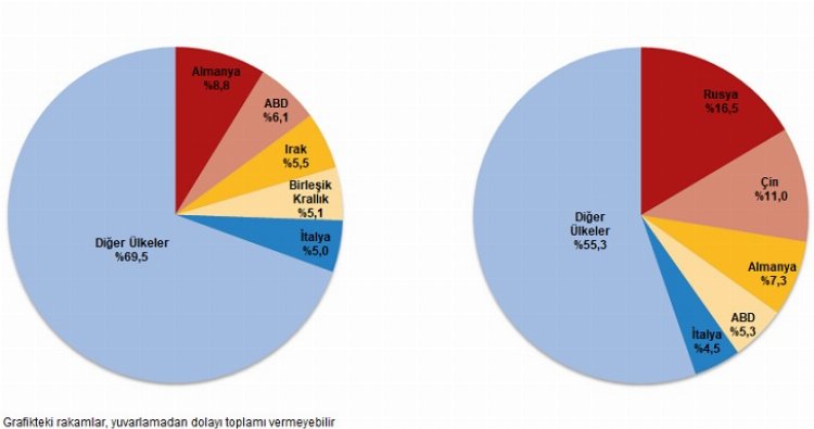 İthalatta Rusya Federasyonu ilk sırayı aldı. Ocak ayında Rusya Federasyonu’ndan yapılan ithalat 4 milyar 324 milyon dolar olurken, bu ülkeyi sırasıyla; 2 milyar 893 milyon dolar ile Çin, 1 milyar 918 milyon dolar ile Almanya, 1 milyar 402 milyon dolar ile ABD, 1 milyar 187 milyon dolar ile İtalya izledi. İlk 5 ülkeden yapılan ithalat, toplam ithalatın yüzde 44,7’sini oluşturdu.