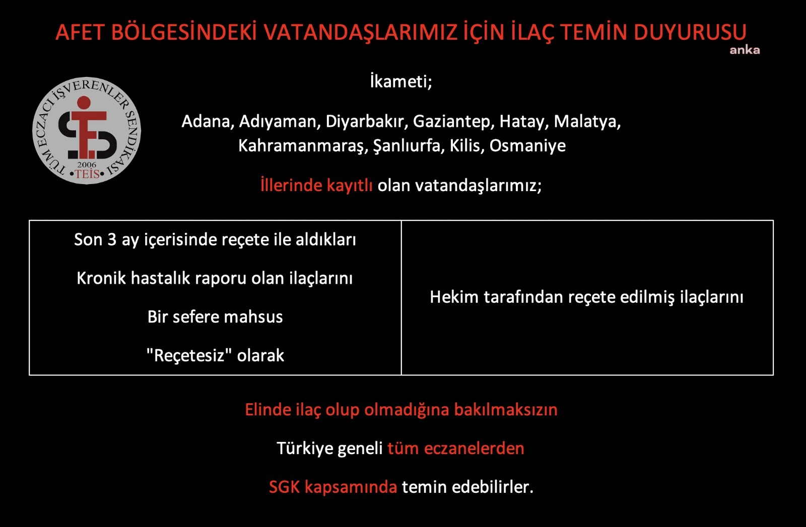“Birlik olarak Adana, Adıyaman, Diyarbakır, Gaziantep, Hatay, Malatya, Kahramanmaraş, Şanlıurfa, Kilis ve Osmaniye olmak üzere 10 ilde vatandaşlarımızın eksik ilaç sorunu yaşamaması için SGK’ya başvurduk. .. SGK ayrıca kronik hastalığı olan depremzedelerin ilaçlarını tek seferlik reçetesiz alacakları duyurusunu yaptı.. Depremzedeler reçeteli ilaçlarını SGK Medula sisteminde ikamet yerine bakılarak ülkemizdeki tüm eczanelerden temin edebilirler. .. Garanti Kurumu’ndan eczacılar olarak depremzedelerin muayene ücretinden muaf tutulmalarını rica ediyoruz.