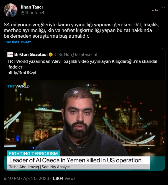 “84 milyon vergi ile kamu kuruluşu olması gereken TRT, ırkçılığı, mezhep ayrımcılığını, kin ve nefreti körükleyen bu şahsı beklemeden soruşturma başlatmalıdır.”
