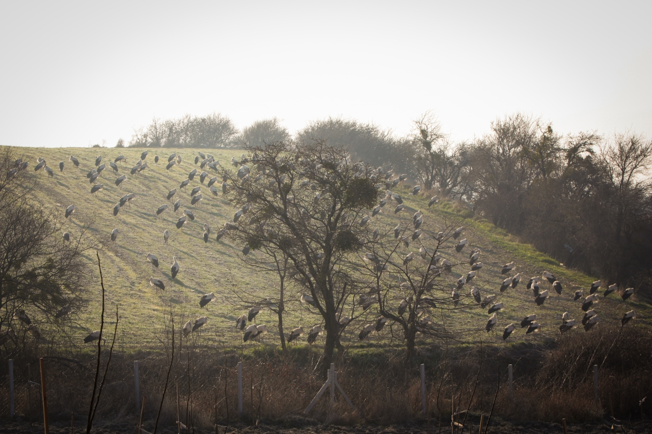 Baharın iklimini hissettirmesiyle sıcak bölgelere göç eden leylekler, bölgedeki sürülmüş ve ekili arazilerde dönerek mola verdi.