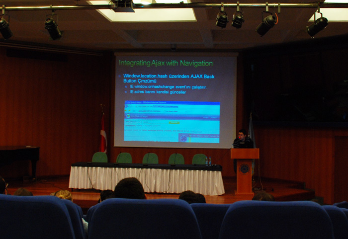 Webinarın üçüncü bölümünde Uğur Umutoğlu, .NET framework 3.5 ile gelen Linq’in nasıl kullanılacağını anlattı. Linq, dille tümleşik sorgu olarak da bilinir. Yazılımla uğraşanlar için MSSQL veya MYSQL vb. Kodlamada veritabanı programlarından aşina oldukları benzer SQL sorguları yapabilmemizi sağlar. Örneğin veritabanından veri çektikten sonra bu sonuçları istediğim gibi filtreleyebiliriz ve bunu yaparken veritabanını tekrar tekrar sorgulamaya gerek kalmıyor. Aynı sözdizimini XML’de de kullanabiliriz ki bu gerçekten harika bir özelliktir. Uğur Umutoğlu seminerde C# kullanımını gösterdi. Salondaki büyük çoğunluk C# programcılarıydı. Daron Yondem C#’ı sevmese de Linq’in kullanımını Uğur Bey’in ardından VB.net’te büyük bir zevkle paylaştık. Ancak işim olmadığı için semineri sonuna kadar izleyemedim. Videoları koyalım, siteden linkleri atayım inşallah. Gelmek isteyip de gelemeyenlere yardımcı olması dileğiyle.
