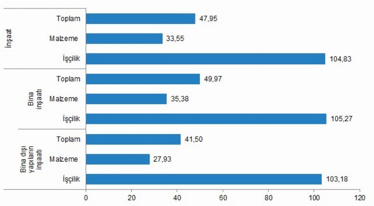 Bina dışı inşaat maliyet endeksi bir önceki aya göre %0,22 azalırken, bir önceki yılın aynı ayına göre %41,50 arttı. Bir önceki aya göre malzeme endeksi yüzde 0,78 azalırken, istihdam endeksi yüzde 1,42 arttı. Geçen yılın aynı ayına göre malzeme endeksi de yüzde 27,93, işçilik endeksi yüzde 103,18 arttı.