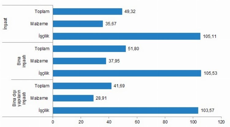 Aylık bazda malzeme endeksi yüzde 5,81, işçilik endeksi yüzde 0,86 arttı. Yıllık bazda malzeme endeksi yüzde 35,67, işçilik endeksi yüzde 105,11 artış gösterdi.