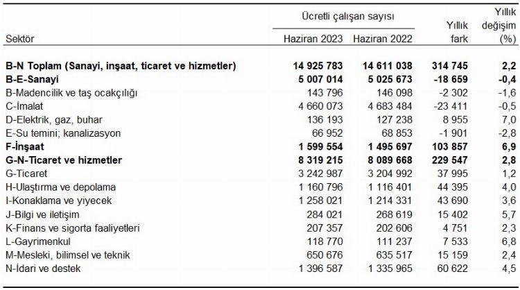 Ücretli çalışan sayısı bir önceki yılın aynı ayında 14 milyon 611 bin 38 kişi iken, 2023 yılı Haziran ayında 14 milyon 925 bin 783 kişi oldu.