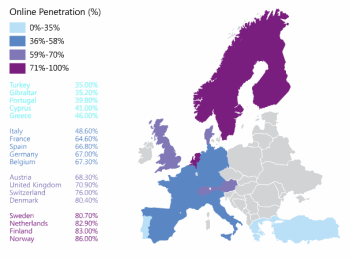 Yukarıdaki görselde ülkelerin internet kullanımları renklerle belirtilmiş, tabloyu incelediğimizde İskandinav ülkelerinde internet kullanımının %80 civarında olduğu ancak Türkiye, Portekiz gibi ülkelerde bu oranın %40’lara düştüğü dikkat çekiyor. Araştırmanın ardından Microsoft yaptığı açıklamada, internet kullanımının henüz yaygın olmadığı ülkelerdeki oranların İskandinavya ile aynı seviyeye çıkacağını ancak İskandinavya’da yüzde 80’e çıkmasının beklenmediğini söyledi.