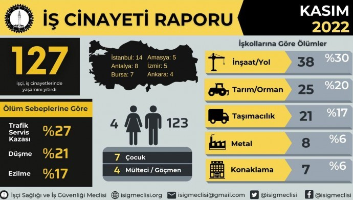 İş Sağlığı ve Güvenliği Konseyi (ISIG), iş cinayetlerine ilişkin Kasım ayı raporunu açıkladı. Kasım ayında 127 işçinin yaşamını yitirdiğine değinilen raporda, 2022’nin ilk 11 ayında ezilme, patlama, yüksekten düşme, zehirlenme ve asbest nedeniyle 658 işçinin yaşamını yitirdiği belirtildi. Raporda, en fazla ölümün yol yapım sektöründe, 327 ile tarımsal ormancılık sektöründe olduğu belirtilirken, en az ölümün ise iki kişinin hayatını kaybettiği haberleşme sektöründe olduğu belirtildi. En fazla işçi cinayetinin işlendiği il ise 229 işçi cinayetiyle İstanbul ve en az 33 işçi cinayetiyle Aydın oldu.