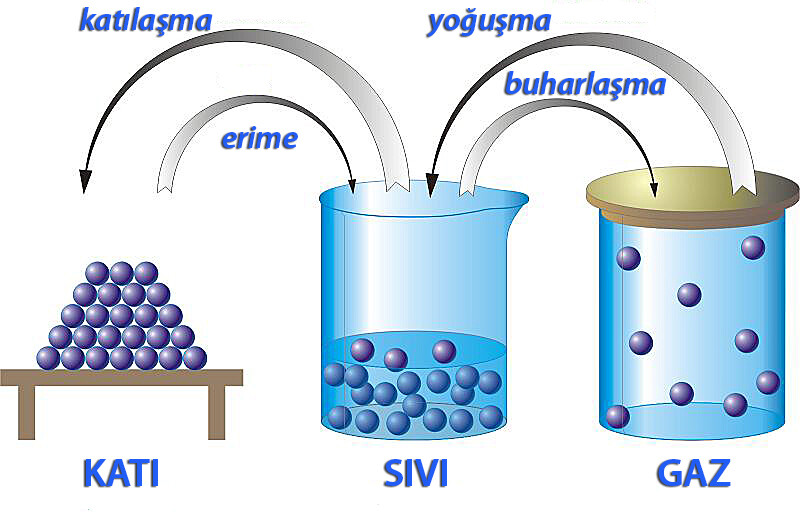 Isıtılan katının türbülansı artar yani taneciklerinin kinetik enerjisi artar ve tanecikler birbirinden uzaklaşmaya başlar. Tanecikler arasındaki çekim kuvveti zayıflar ve katının durumu sıvı hale geçer. Sıvılaşan malzeme ısıtılmaya devam edilirse moleküllerinin hareketi artar ve birbirlerinden uzaklaşmaya devam ederler. Böylece tanecikleri yerçekimi kuvvetiyle yok olacak kadar zayıflamış olan sıvı haldeki madde, tekrar hal değiştirerek gaz halini alır.