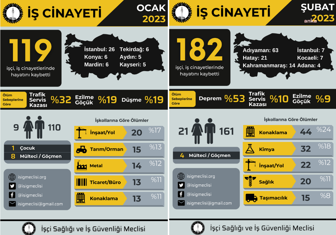 İş Sağlığı ve Güvenliği Derneği’nin yayınladığı rapordaki tabloya göre; Ocak ayında en az 119 işçi öldü ve Şubat ayında 182 işçi öldü. Söz konusu programda Ocak ayında İstanbul’da 26, Konya’da 6, Mardin’de 6, Tekirdağ’da 6, Aydın’da 5 ve Kayseri’de 5 işçi hayatını kaybetti. İş cinayetlerinin yüzde 32’si trafik kazası, yüzde 19’u ezici sıyrık, yüzde 19’u ise düşme sonucu meydana geldi.