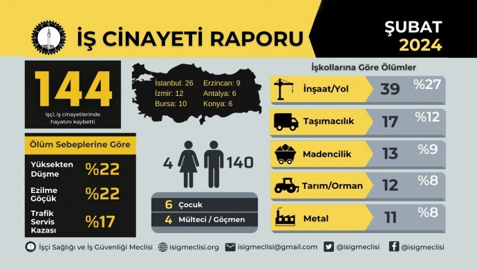 İSİG Meclisi’nin ulusal ve yerel basından, işçilerin mesai arkadaşları, aileleri, iş güvenliği uzmanları, işyeri hekimleri, sendikalar derlediği bilgilere dayanarak hazırladığı rapora göre, Şubat ayında en az 144, her gün “en az” 5 işçi iş cinayetlerinde hayatını kaybetti.