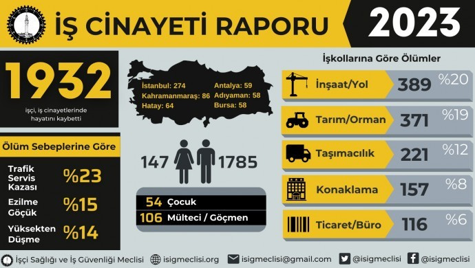 İşçi Sağlığı ve İş Güvenliği (İSİG) Meclisi, 2023 yılı İş Cinayeti Raporu’nu açıkladı. Rapora göre, bir yılda bin 932 işçi, iş cinayeti sonucu hayatını kaybetti. Raporda iş cinayetinin en çok yaşandığı kent İstanbul olarak belirtildi. Buna göre, İstanbul’da 274 işçi hayatını kaybederken, İstanbul’u sırasıyla 86 işçi ölümü ile Mereş, 64 işçi ölümü ile Hatay, 59 işçi ölümüyle Antalya, 58 işçi ölümü ile Semsûr ve Bursa takip etti.