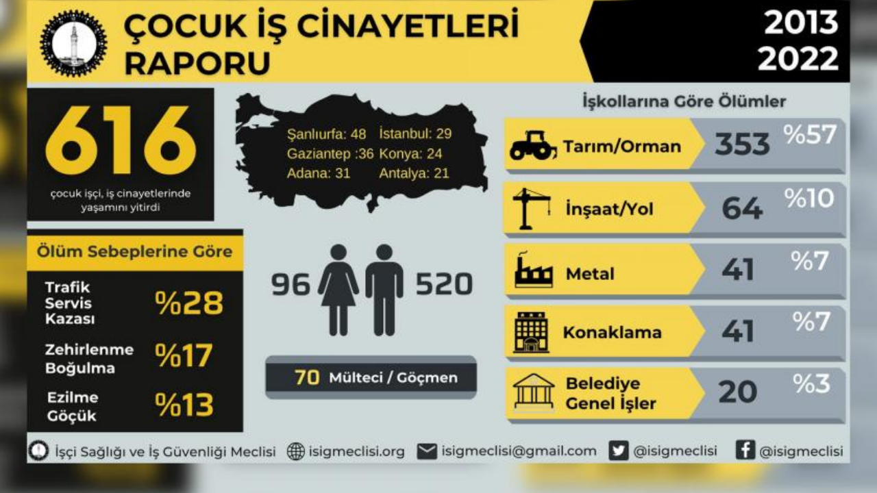 ISIG’in iş cinayeti raporlarına göre; 2013’ten bu yana geçen on yılda, “en az” 616 çocuk çalışırken hayatını kaybetti. Bu çocukların 96’sı kız, 520’si erkektir. 4’ü 4 yıl, 5 5 yıl, 4 6 yıl, 5 7 yıl, 12 8 yıl, 12 9 yıl, 24 10 yıl, 13 11 yıl, 32’si 12 yıl, 39 13 yıl, 61 14 yıl, 87 Yılda 15 yıl, 123 16 yıl ve 195 17 yıl. Bu dönemde “iş cinayetleri” sonucu toplam 18.683 ölüm meydana geldi.