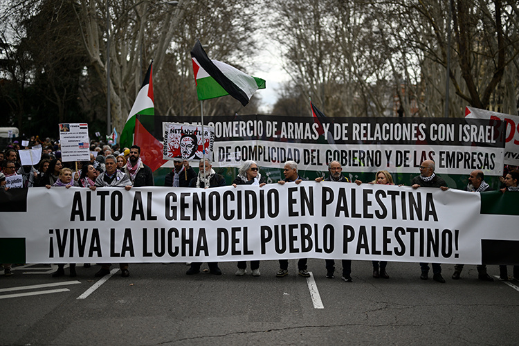 Başkent Madrid’de yoğun katılımla düzenlenen yürüyüşte, “İsrail’e boykot”, “Katil Netanyahu”, “Soykırımı durdurun”, “Özgür Filistin” sloganları atılarak, uluslararası topluma ateşkes için “İsrail’e baskı” çağrısında bulunuldu.