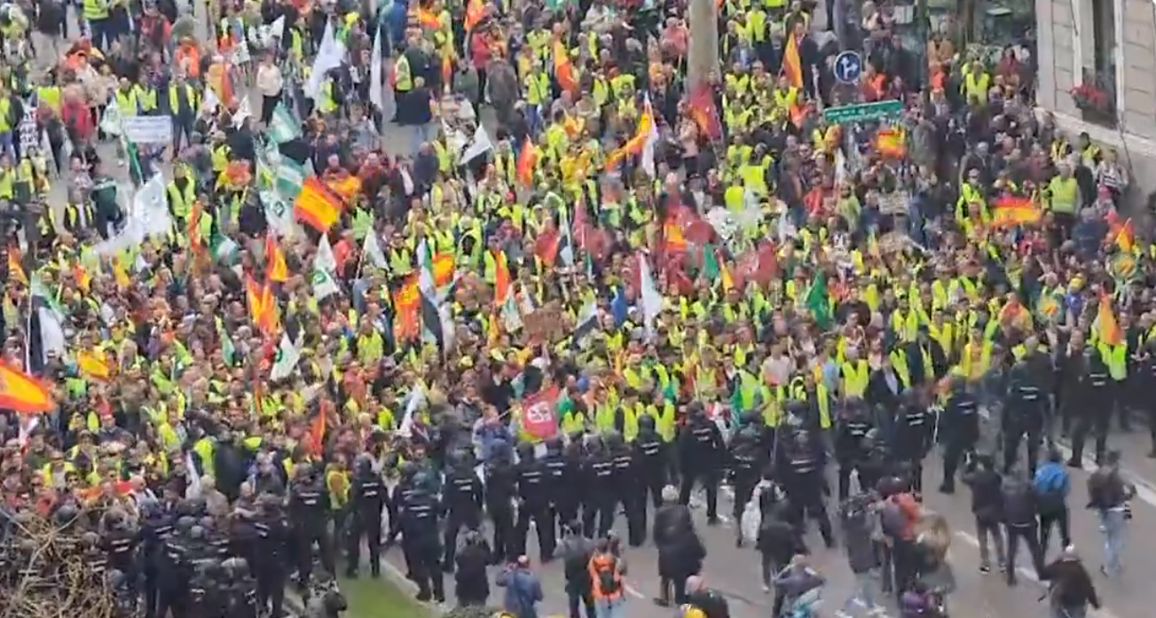 Gösteri için Madrid’e gelen çiftçiler ile traktörleriyle meydana ulaşan çiftçiler, Tarım, Gıda ve Balıkçılık Bakanlığı binasına doğru yürümek istedi.