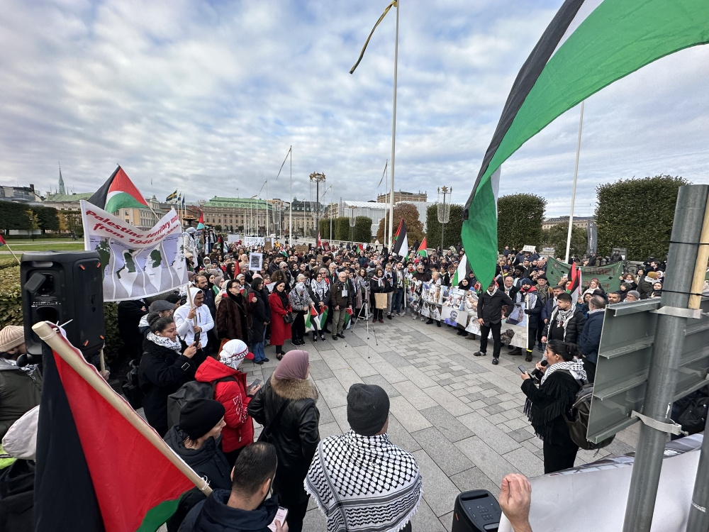 Başkentte İsveç Parlamentosu önünde toplanan yüzlerce kişi, “Filistin soykırımına son”, “Etnik temizliği finanse etmeyi durdurun” ve “Netanyahu savaş suçlusudur” yazılı pankartlar taşıdı.