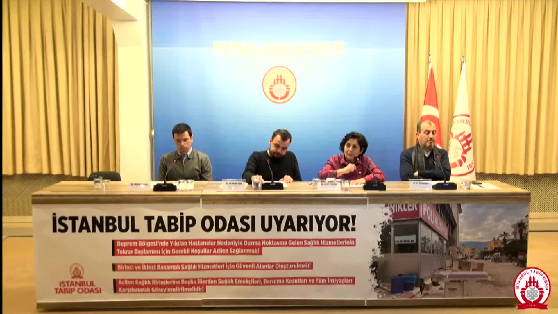 İstanbul Tabip Odası bugün bir basın toplantısı düzenleyerek halkı deprem bölgesinin yaşadığı sorunlara karşı sorumlu davranmaya ve mevcut tabloyu iyileştirmeye çağırdı. Cağaloğlu’ndaki İTO binasında, “İstanbul Tabip Odası uyarıyor, deprem bölgesindeki hastanelerin çökmesi nedeniyle kesintiye uğrayan sağlık hizmetlerinin yeniden başlayabilmesi için gerekli koşullar acilen sağlanmalı, birinci basamak ve hastaneler için güvenli alanlar oluşturulmalıdır. ikinci basamak sağlık hizmetleri, sağlık birimleri diğer illerden acilen sağlık birimlerine sevk edilmeli, barınma koşulları ve tüm ihtiyaçları karşılanarak işçiler atanmalıdır.