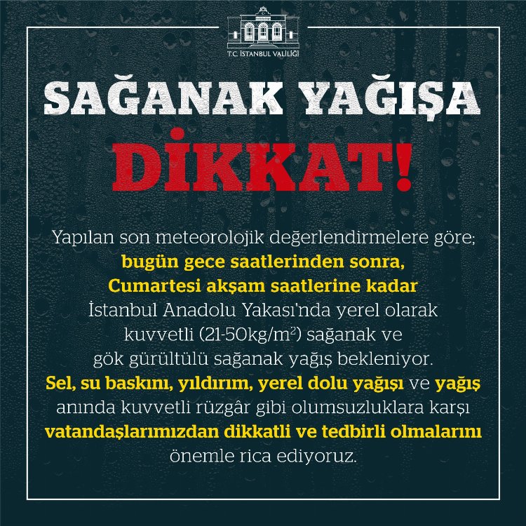 İstanbul Valiliği, meteorolojiden alınan son verilere göre vatandaşları dikkatli olmaları konusunda uyardı.