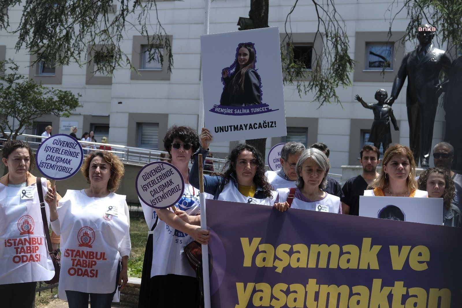 İstanbul Tabip Odası’nın (İTO) daveti üzerine Zeynep Camel Kadın ve Çocuk Eğitim ve Araştırma Hastanesi önünde toplanan doktor ve sağlık çalışanları, Dr. Melik Bağce’nin boşanma sürecindeki eşi tarafından öldürülmesini 13 Haziran’da görev yaptığı Alanya’daki 5 Nolu Aile Sağlığı Merkezi’nde protesto etti.