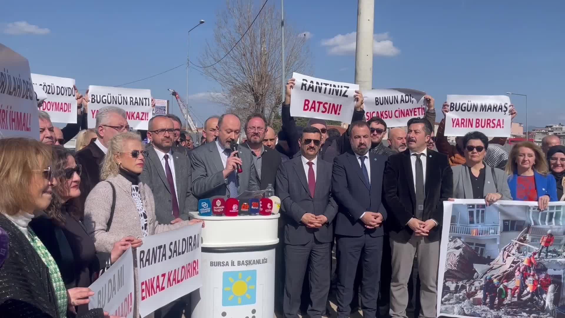 İYİ Parti Bursa Başkanlığı, Bursa’nın Tabakhane semtinde başlayan konut ve işyeri projesini protesto etti. İYİ Parti Bursa Genel Başkanı Mehmet Hasanoğlu, Bursa Büyükşehir Belediyesi’ne çağrıda bulunarak, “Bugün ülkemizde yaşanan afetlerden, yarın Bursa’da yaşanabilecek afetlerden ders alın ve bu inşaatları bir an önce durdurun. Durdurmazsanız yakında bu şehre kim hükmedecekse biz duracağız.Gelin bu yanlıştan uzaklaşın, yol yakındır.”
