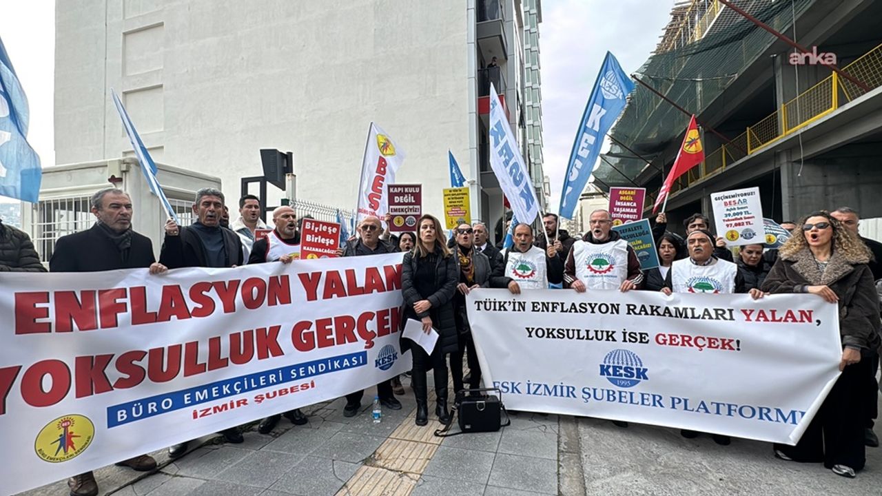 Kamu Emekçileri Sendikaları Konfederasyonu (KESK) İzmir Şubeler Platformu üyeleri, Türkiye İstatistik Kurumu (TÜİK) İzmir Bölge Müdürlüğü binası önünde bir araya gelerek açıklanan yıllık enflasyon verilerini protesto etti. Platform adına basın açıklamasını okuyan Büro Emekçileri Sendikası (BES) İzmir Şube Başkanı Deniz Çetin, kurum tarafından paylaşılan rakamların sahadaki hayat pahalılığı ile örtüşmediğini kaydetti.