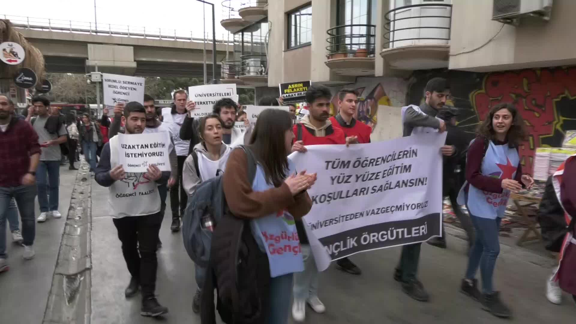 İzmir’deki üniversite öğrencileri, Kahramanmaraş’ta yaşanan deprem felaketinin ardından üniversitelerde uzaktan eğitime geçilmesini protesto etti. Depremzedeler için KYK yurtlarının değil misafirhanelerin açılması gerektiğini söyleyen öğrenciler, “Üniversiteden vazgeçmiyoruz.”