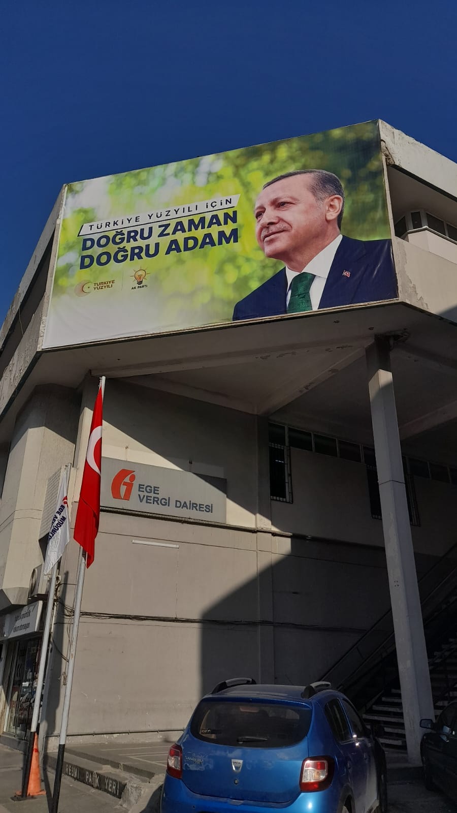 İzmir’in Konak ilçesine bağlı Yenişehir ilçesindeki Ege Vergi Dairesi binasına AKP logosu ve sloganının yer aldığı afiş asıldı.