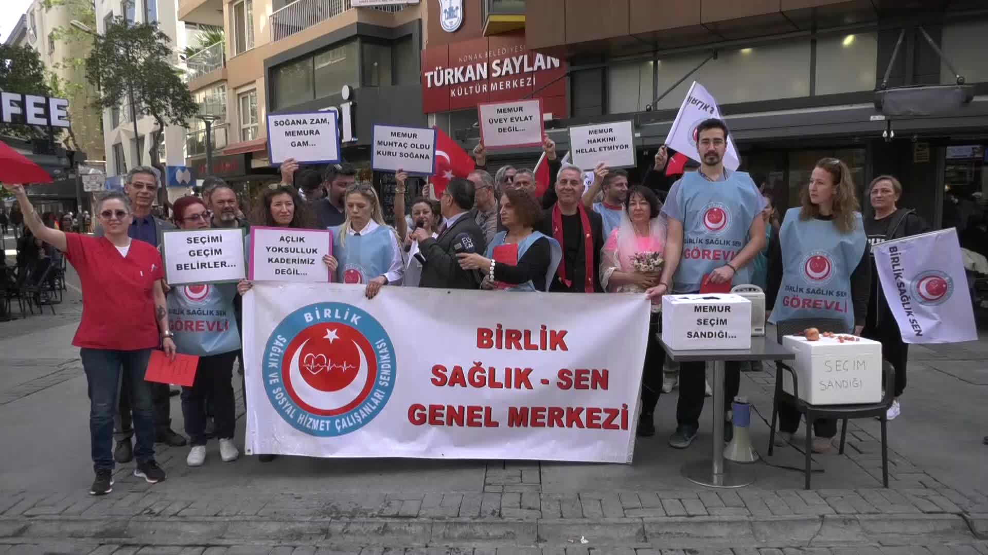 BASK’a bağlı Birlik Sağlık Sen üyesi memurlar, bugün İzmir’de bir basın açıklaması yaparak ek maaş zammını protesto etti. Görevliler de yanlarında getirdikleri sandığa oy pusulası yerine maaş bordrosunu atarak, “Zam ne kadar artarsa oy o kadar artar” dedi. Kıbrıs Şehitleri Caddesi’ne düzenlenen protestoda Birlik Sağlık Sen Genel Başkanı Ahmet Doğrul basın açıklamasını okudu.