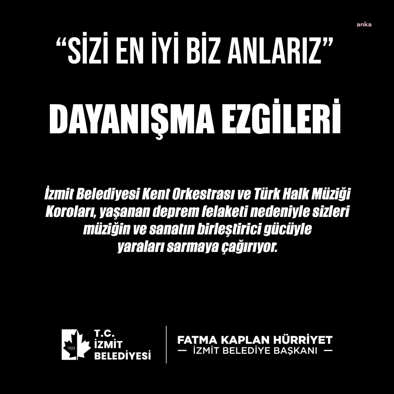 Kahramanmaraş’ta 6 Şubat’ta yaşanan depremin ardından bölgede çadırkent, aşevi, psikososyal destek ve sokak hayvanları için çalışmalarını sürdüren İzmit Belediyesi, orkestra ve korolarının katılımıyla dayanışma programları düzenleyecek. Programların tarihleri ve içerikleri önümüzdeki günlerde belirlenerek kamuoyuna duyurulacak.