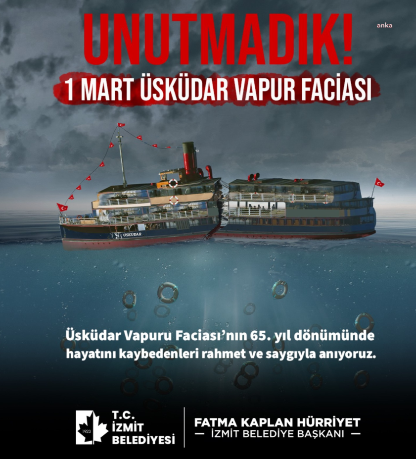 65 yıl önce İzmit Vapur İskelesi’nden ayrıldıktan kısa bir süre sonra fırtınaya tutulup batan Üsküdar Vapuru No.72’de yer alan; Çoğu Sanat Okulu ve İzmit Lisesi öğrencileri olmak üzere 392 kişi hayatını kaybetti. İzmit Belediyesi, bu yıl Türkiye’nin en büyük sivil deniz kazasında hayatını kaybedenleri anmak için bir program düzenleyecek.