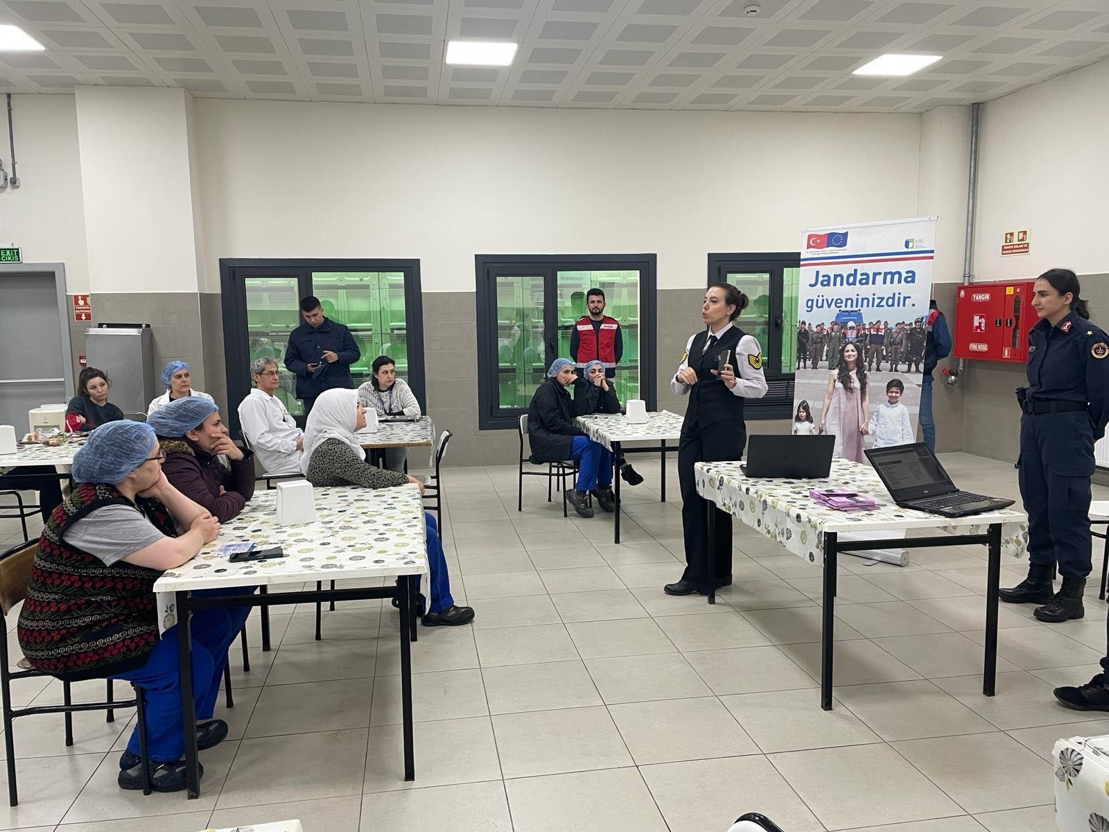 Kadın işçilere 6284 sayılı kanun ve KADES uygulaması hakkında bilgilendirme yapan jandarma “Sabretme ihbar et, tek tuşla jandarma yanında “mesajının altını çizerek yüzlerce kadının telefonuna KADES uygulamasını yükledi.