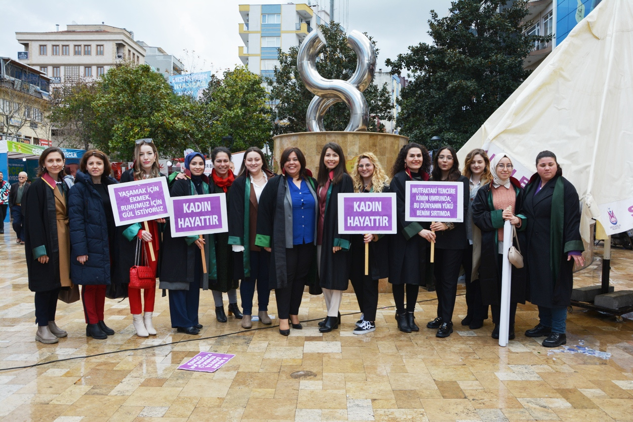 Komisyon Başkanı Av. Sinem Sart Urgancı, “8 Mart, “eşit işe eşit ücret” isteyen kadınların neredeyse iki yüz yıl öncesinden bugünkü eşitlik ve adalet mücadelemize ışık tuttuğu dayanışmanın ve direnişin adı; tüm dünyada kadının insan hakkı ihlallerine karşı yaşamın her alanında eşitlik ve adalet talep etme kararlılığın, ayrımcılığa ve şiddete karşı duruşun ve örgütlü kadın mücadelesinin sembolüdür. Başta, Cumhuriyetimizin devrim yasalarından olan ve kadın ile erkeği eşit konuma getirmeyi amaçlayan laik Medeni Kanunumuz olmak üzere örgütlü kadın mücadelesi sonucunda yasal güvenceye kavuşturulan kazanımlarımızın daha ileriye taşınmasını, toplumsal cinsiyet eşitliğinin mutlak surette sağlanmasının, kadına yönelik şiddeti önleyici bütüncül politikaların geliştirilmesini, cinsiyete dayalı ayrımcılığın ve şiddetin son bulmasını savunurken; İstanbul Sözleşmesinden hukuka aykırı bir biçimde keyfiyetle çıkıldığı, şeriat karşıtı düşüncelerini açıkladığı için meslektaşımızın gözaltına alındığı, bir günde 8 kadının katledildiği, uygulanan cezasızlık politikalarının erkek failleri daha da cesaretlendirdiği bir süreçten geçiyoruz.