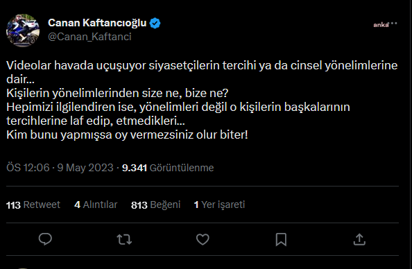 CHP İstanbul İlçe Başkanı Kanan Kaftancıoğlu, siyasetçilerin cinsel yönelimiyle ilgili yorumların yer aldığı video paylaşımlarına yanıt verdi. Kaftancıoğlu, sosyal medya hesabından yaptığı paylaşımda, “Siyasetçilerin tercihleri veya cinsel yönelimleri ile ilgili videolar yayında… İnsanların size veya bize karşı tavırları bizi ne ilgilendiriyor? Hepimiz için önemli olan yönelimleri değil, hepimizi ilgilendiriyor.” yoksa bu insanlar başkalarının tercihlerinden mi bahsediyor… Bunu kim yaparsa oy vermeyeceksiniz, biter.”