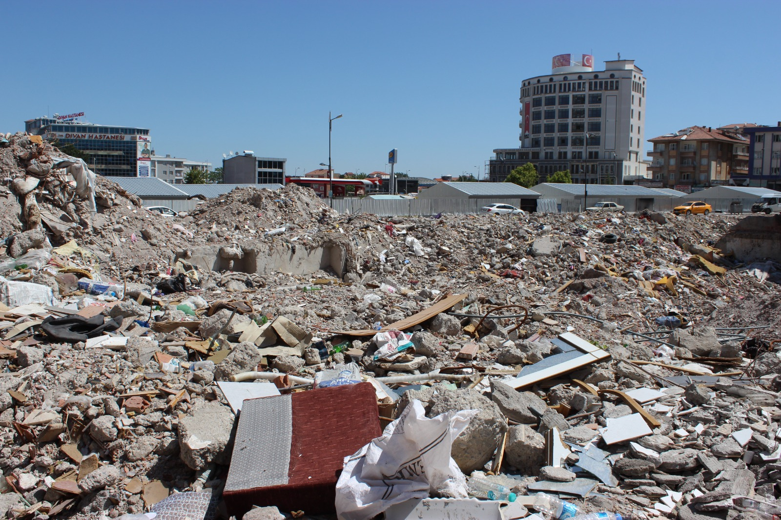 Görünüşte, beş aylık aradan sonra her gün yerel tüccarları 6 Şubat’a taşıyan enkaz kaldırılmayı bekliyor. Enkaz ve moloz yığınına uyanan esnaf, Çevre Yolu üzerindeki Eski Köy Garajı olarak bilinen bölgede bulunan enkazın bir an önce kaldırılmasını istiyor. Enkazdan koku yükseldikçe, toz açığa çıkar.