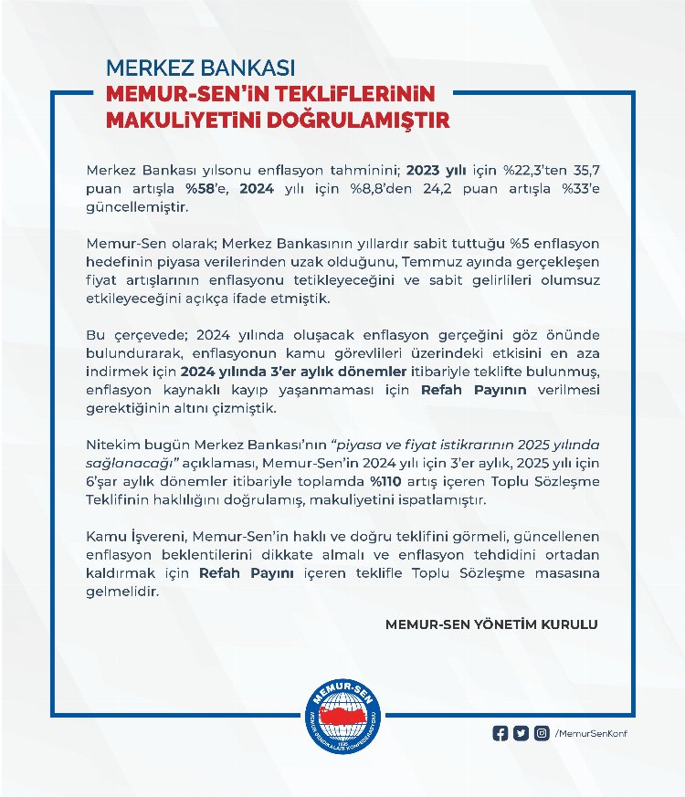 Memur-Sen Genel Başkanı Ali Yalçın, 1 Ağustos itibarıyla başlayacak olan 7. Dönem Toplu sözleşme görüşmelerinde talep edecekleri zam oranları ve beklentileri için 2 yıllık süreçte toplamda yüzde 110 oransal artış teklif ettiklerini söylemişti.