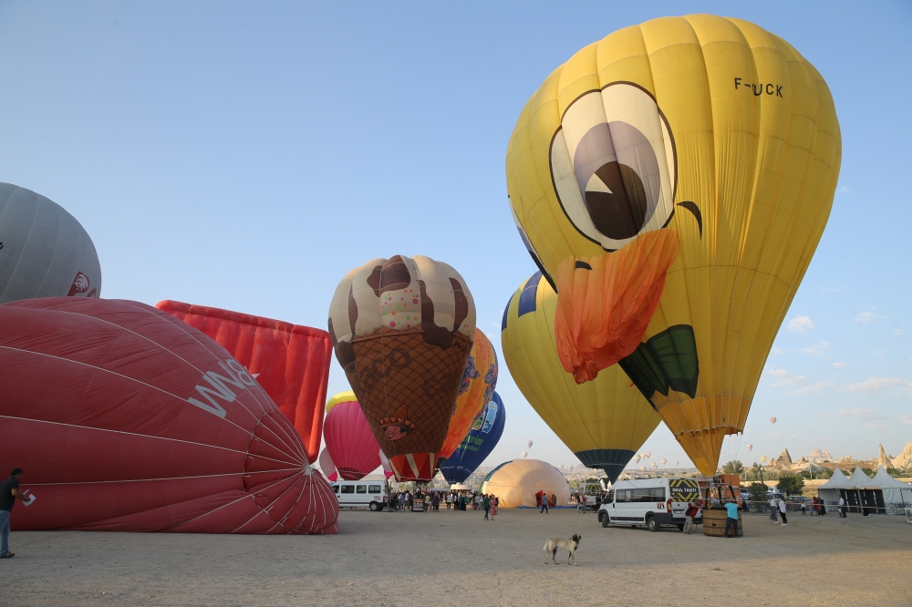 “Kalp,” “dondurma”, “ördek”, “Oburiks”, “ahtapot”, “Türk bayrağı” gibi çeşitli figürlerdeki sıcak hava balonları peribacalarıyla kaplı vadilerin üstünde süzüldü.