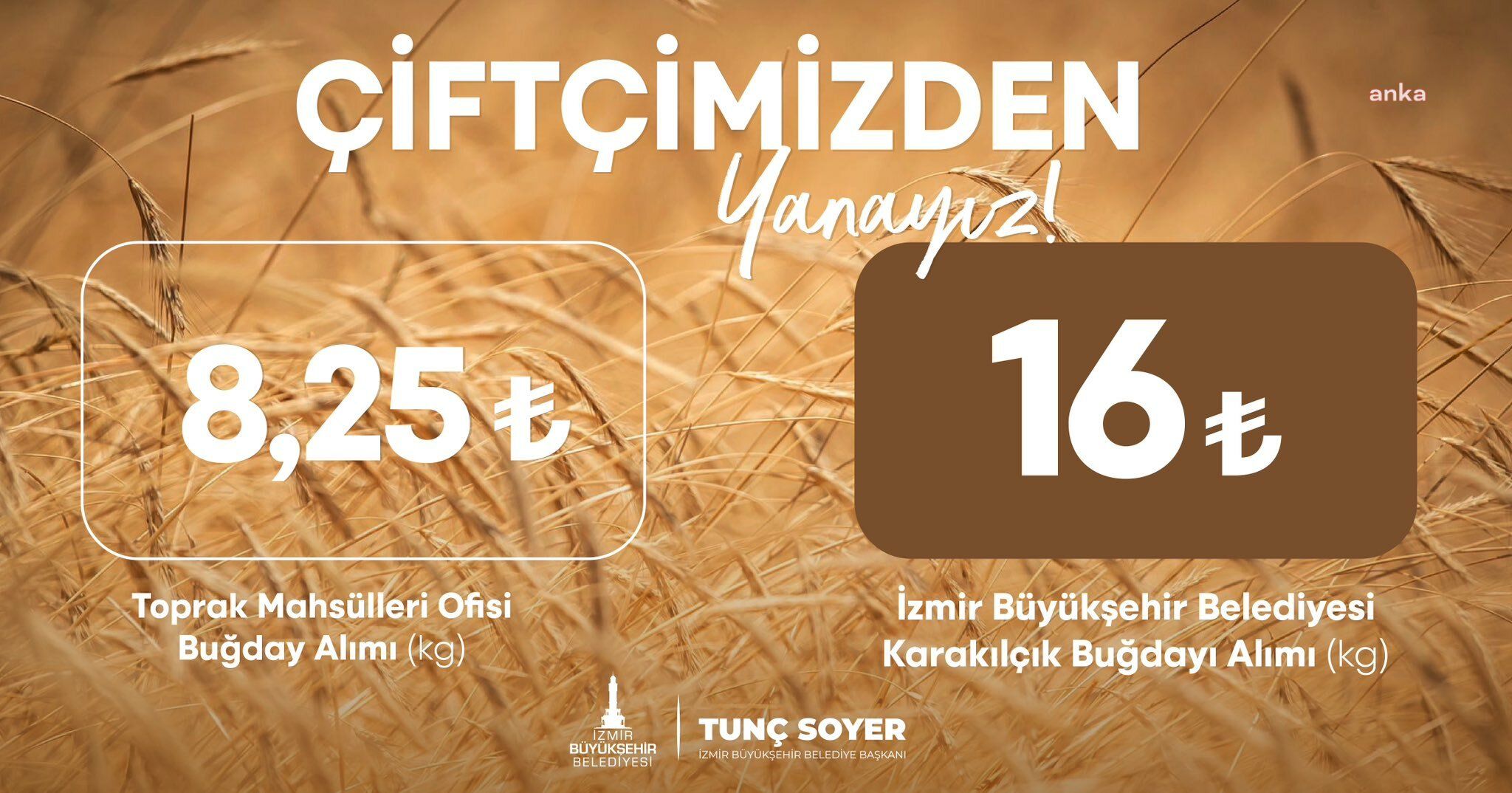 Soyer, TMO’nun 8,25 lira olan buğday alım fiyatı ile İzmir Büyükşehir’in 16 lira olan buğday alım fiyatının yan yana olduğu “Çiftliklerimizin yanındayız” başlıklı bir fotoğraf da ekledi.