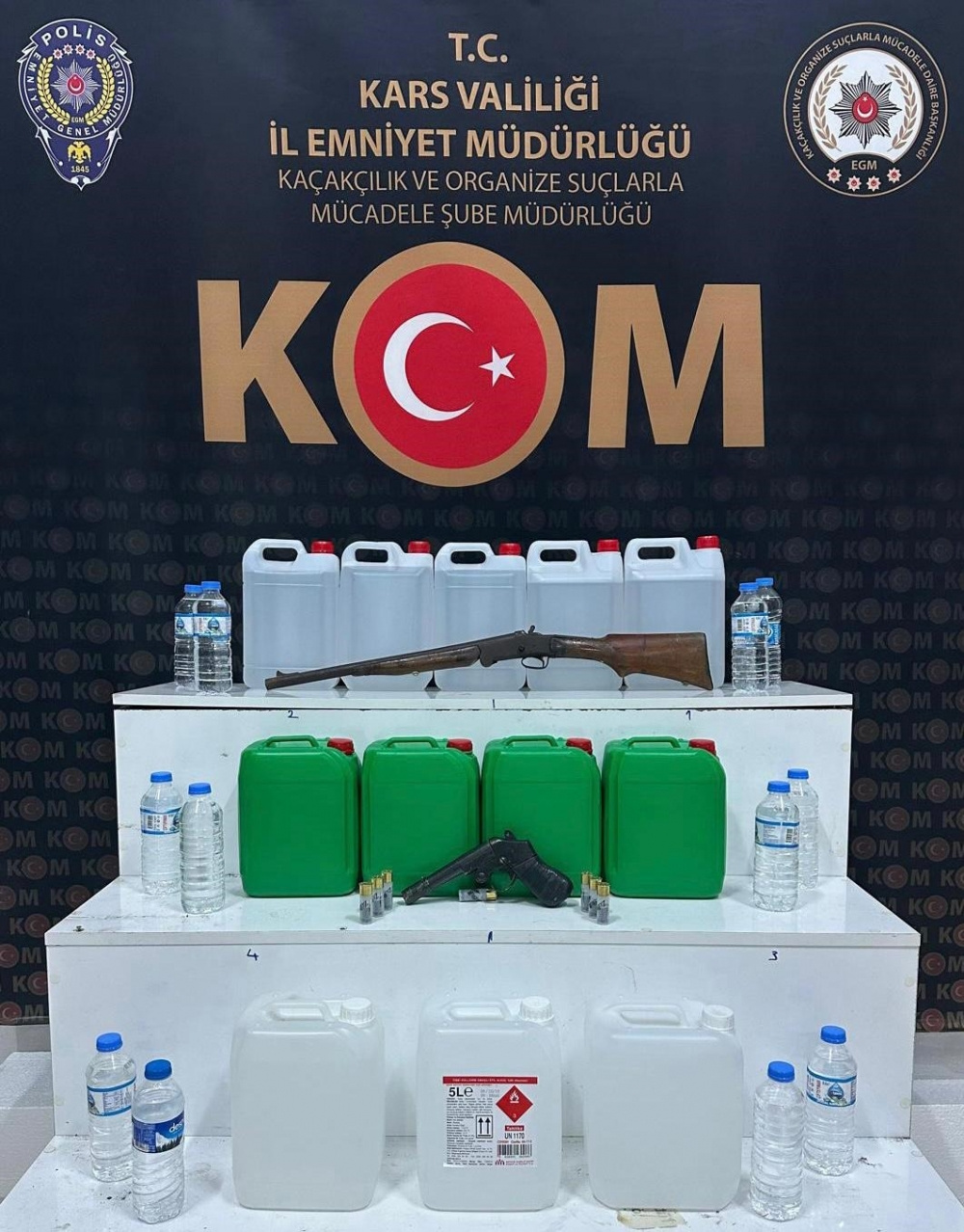 KARS (AA) – Kars’ta düzenlenen operasyonda sahte içki yapımında kullanılan 60 litre etil alkol, 6 litre sahte alkol ve ruhsatsız silahlar ele geçirildi.
