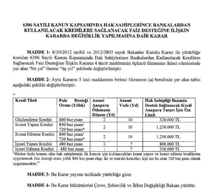 Çevre, Şehircilik ve İklim Değişikliği Bakanlığı’nın yayımladığı kararda yer alan düzenleme ile inşaat, satın alma ve konsolidasyon kredilerine faiz desteği sağlamak amacıyla tahliye veya yıkım tarihinden itibaren kredi verecek bankalara başvuru süresi sınırlandı. 1 yıldan 3 yıla çıkarıldı.
