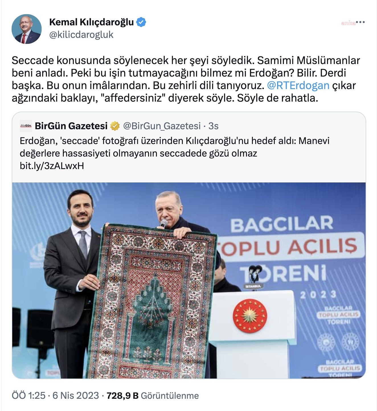 Millet İttifakı’nın Cumhurbaşkanı Adayı ve CHP Genel Başkanı Kemal Kılıçdaroğlu, Cumhurbaşkanı ve AKP Genel Başkanı Recep Tayyip Erdoğan’ın Twitter hesabından “Manevi değerlere duyarlı olmayanın seccadede gözü yoktur” sözlerine; Seccadeler hakkında söylenebilecek her şeyi söyledik. Samimi Müslümanlar beni anlar. Peki bunun olmayacağını Erdoğan bilmiyor mu? Bilinen. Bu farklı. Bu onun etkilerinden biridir. Bu zehirli dili biliyoruz. Erdoğan ağzındaki fasulyeyi çıkar, afedersin de. Söyle ve rahatla.”