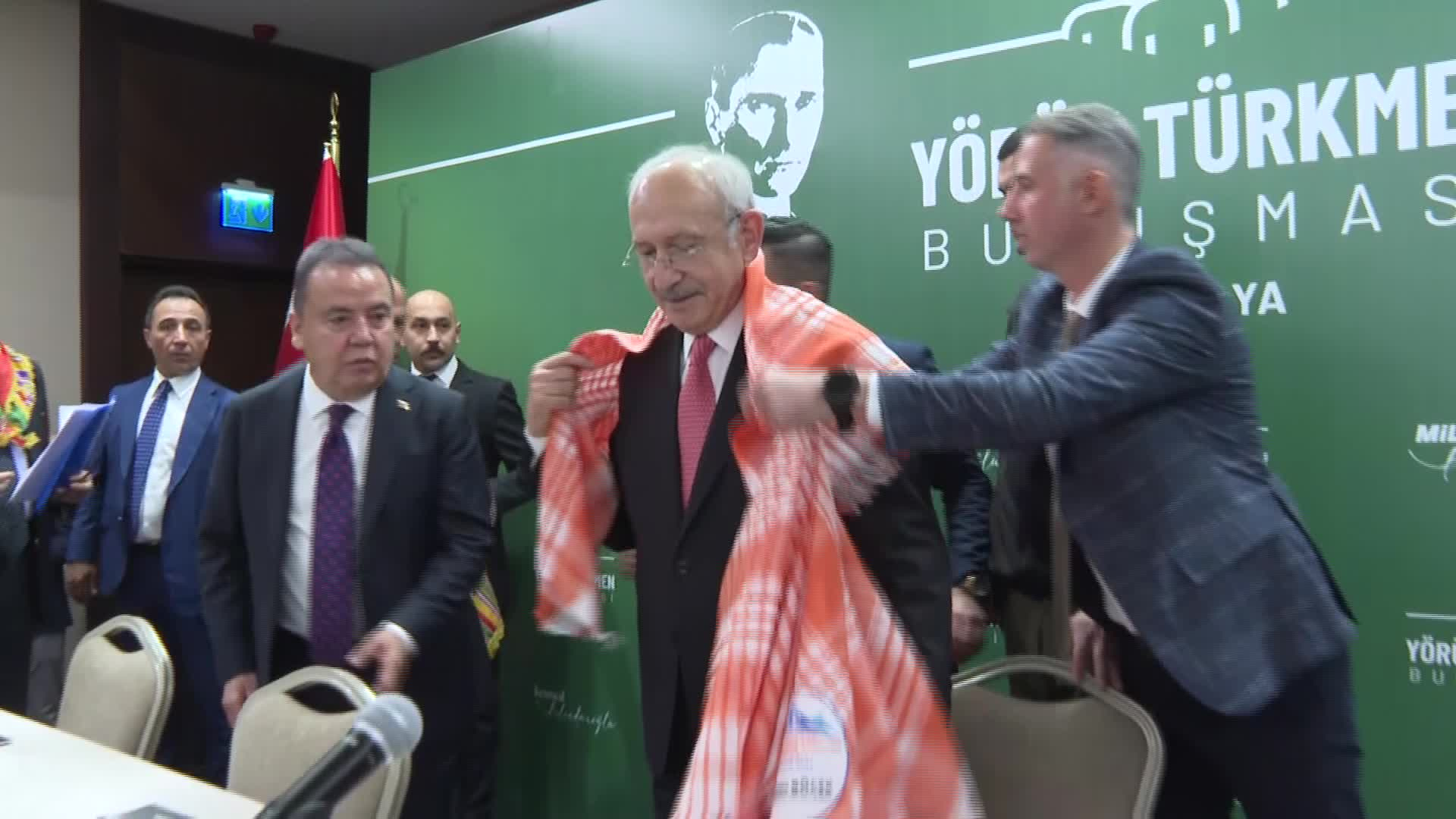 Yörük Türkmen toplantısında CHP lideri Kılıçdaroğlu’na; Kendisine Antalya Büyükşehir Belediye Başkanı Muhitin İnsikt, Başkan Yardımcısı Seyt Torun, Koordinatör Başkan Danışmanı Erdoğan Toprak ve Antalya CHP Antalya İl Başkanı Nuri Cengiz eşlik etti.
