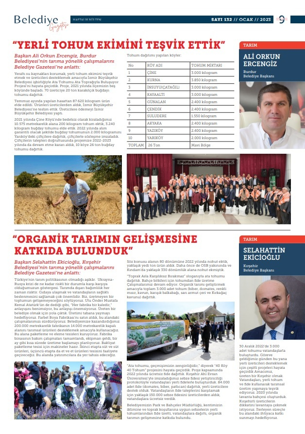 Kırşehir Belediye Başkanı Selahattin Ekişoğlu, CHP Genel Merkezi tarafından dijital ortamda yayınlanan Belediye Gazetesi’nin tarımsal üretim ve iyi tarım uygulamalarına ilişkin sorularını yanıtladı. Ekicioğlu, “Göreve geldiği günden bu yana yerel üreticiyi desteklemek için çeşitli projeleri hayata geçirdik ve uygulamaya devam ediyoruz. Hedefimiz hep birlikte verimli bir Kırşehir inşa etmek.