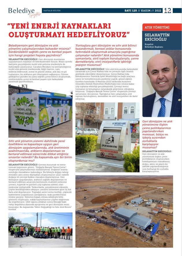 Kırşehir Belediye Başkanı Selahattin Ekişoğlu, Cumhuriyet Halk Partisi (CHP) genel merkezi tarafından dijital ortamda yayınlanan Belediye Gazetesi’nin 125. sayısında geri dönüşüm, atık yönetimi ve sıfır atık uygulamalarına ilişkin açıklamalarda bulundu.