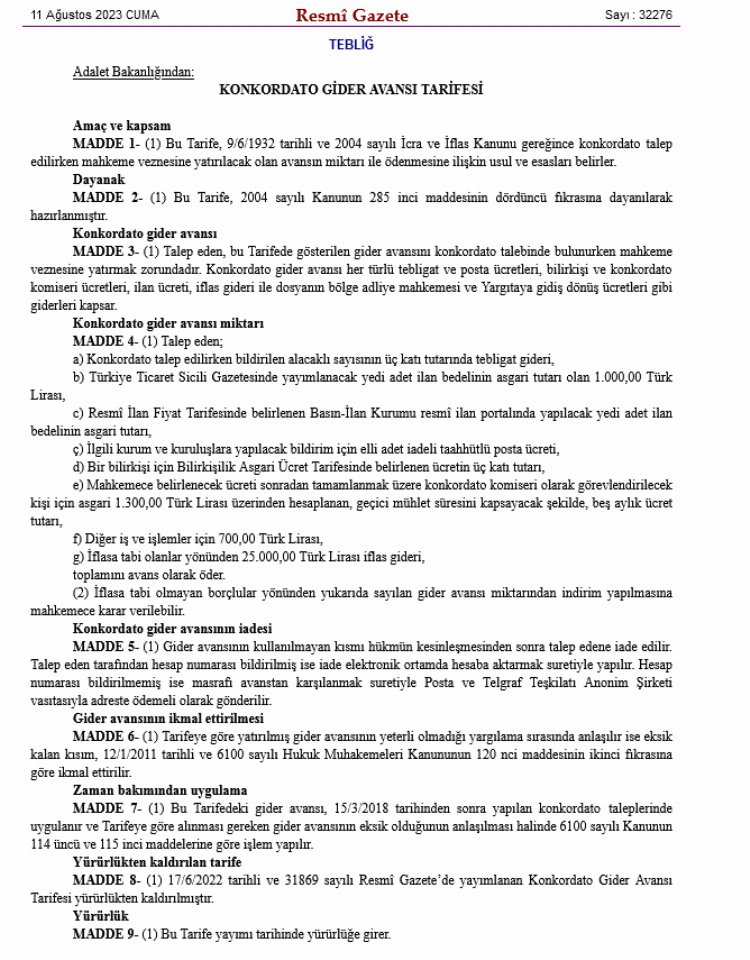 Adalet Bakanlığı’nın İcra ve İflas Kanunu çerçevesinde uygulamada olduğu Konkordato Gider Avansı Tarifesi Resmî Gazete’de yayımlandı.