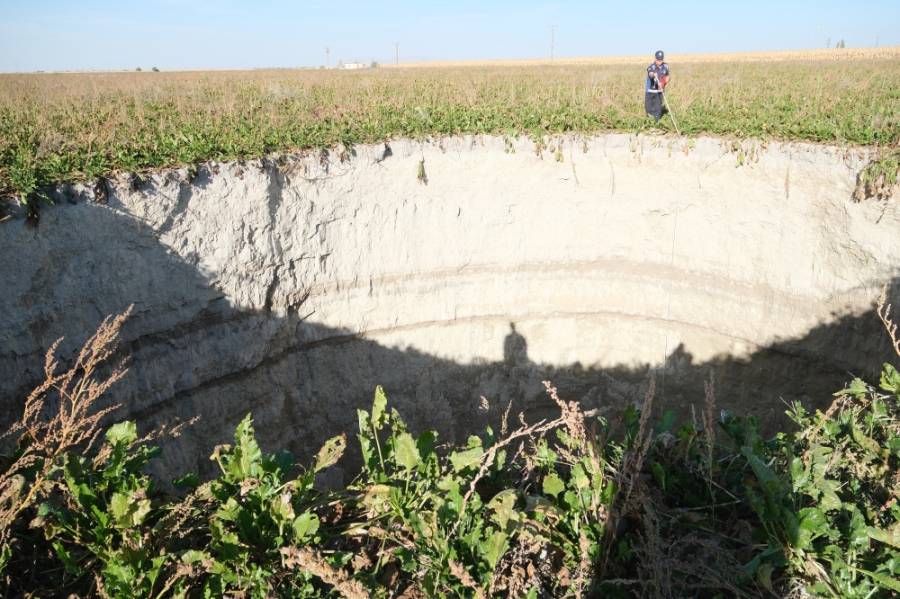 KONYA (AA) – Konya’nın Karapınar ilçesinde pancar tarlasında oluşan obruk tedirginliğe yol açtı.