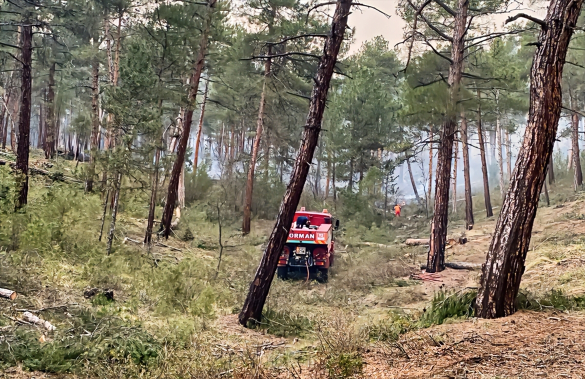 Kütahya Orman Bölge Müdürlüğü ekipleri, karaçam ağaçlarının yoğun olduğu bölgede yangını kontrol altına almak için çalışmalarını sürdürüyor.