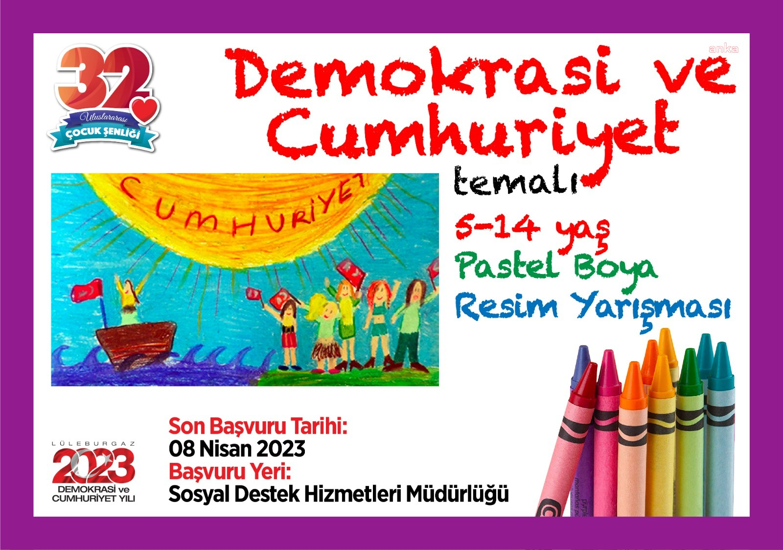 Lüleburgaz’da “Demokrasi ve Cumhuriyet” konulu “23 Nisan Çocuk Bayramı Uluslararası Resim Yarışması” başvuruları yarın başlayacak ve 8 Nisan’da sona erecek. 5-6, 7-8, 9-11 ve 12-14 yaş olmak üzere dört farklı kategoride gerçekleştirilecek olan yarışmaya başvurmak isteyen çocukların, danışma merkezindeki formu doldurmaları yeterli olacaktır. Lüleburgaz Belediyesi Hizmet Binası girişi.