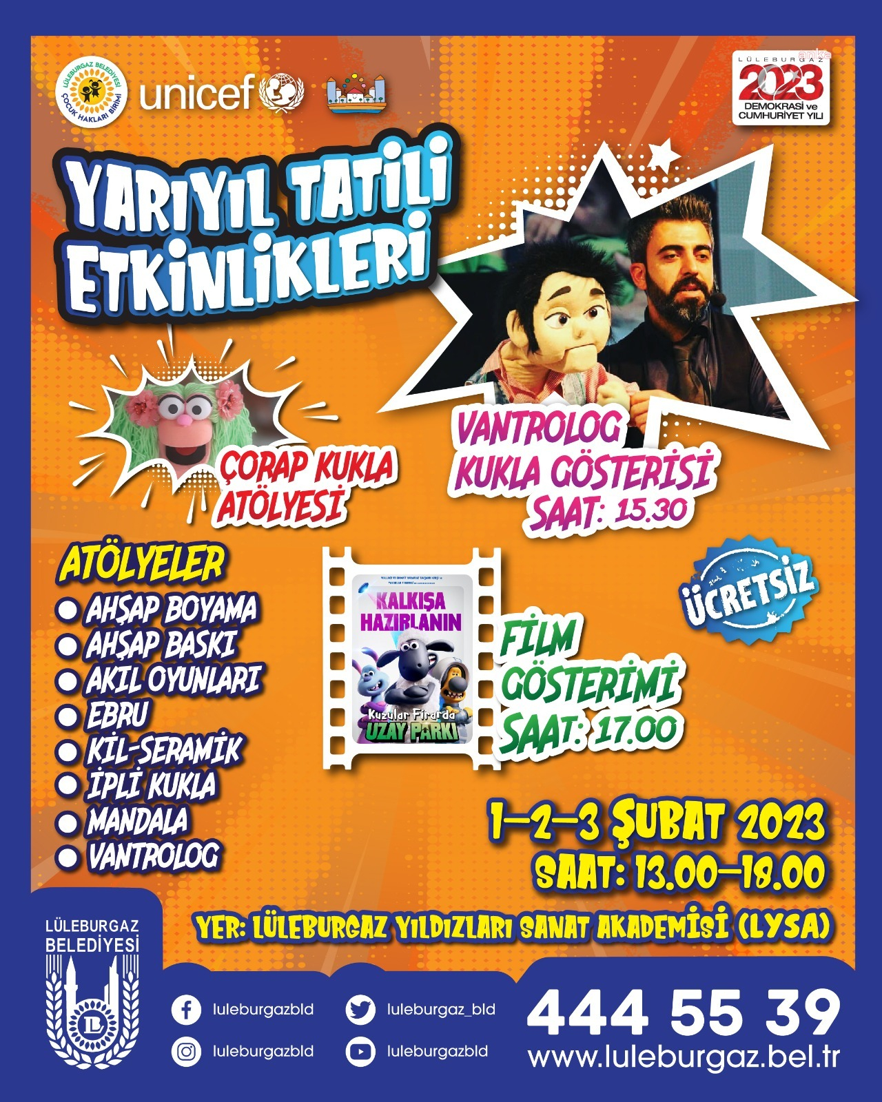 LYSA’da ara sınav etkinlikleri yarın başlıyor. 1-3 Şubat tarihleri arasında gerçekleşecek etkinliklerde çocuklar, ahşap boyama, tahta baskı, akıl oyunları, misket, kil seramik ve mandalaların yanı sıra çorap kukla ve ip gibi atölyelerden ücretsiz olarak yararlanabilecek. Üç gün boyunca 13.00-18.00 saatleri arasında kukla atölyeleri. Ayrıca etkinlikler kapsamında kukla atölyesi ve film gösterimi de düzenlenecek.