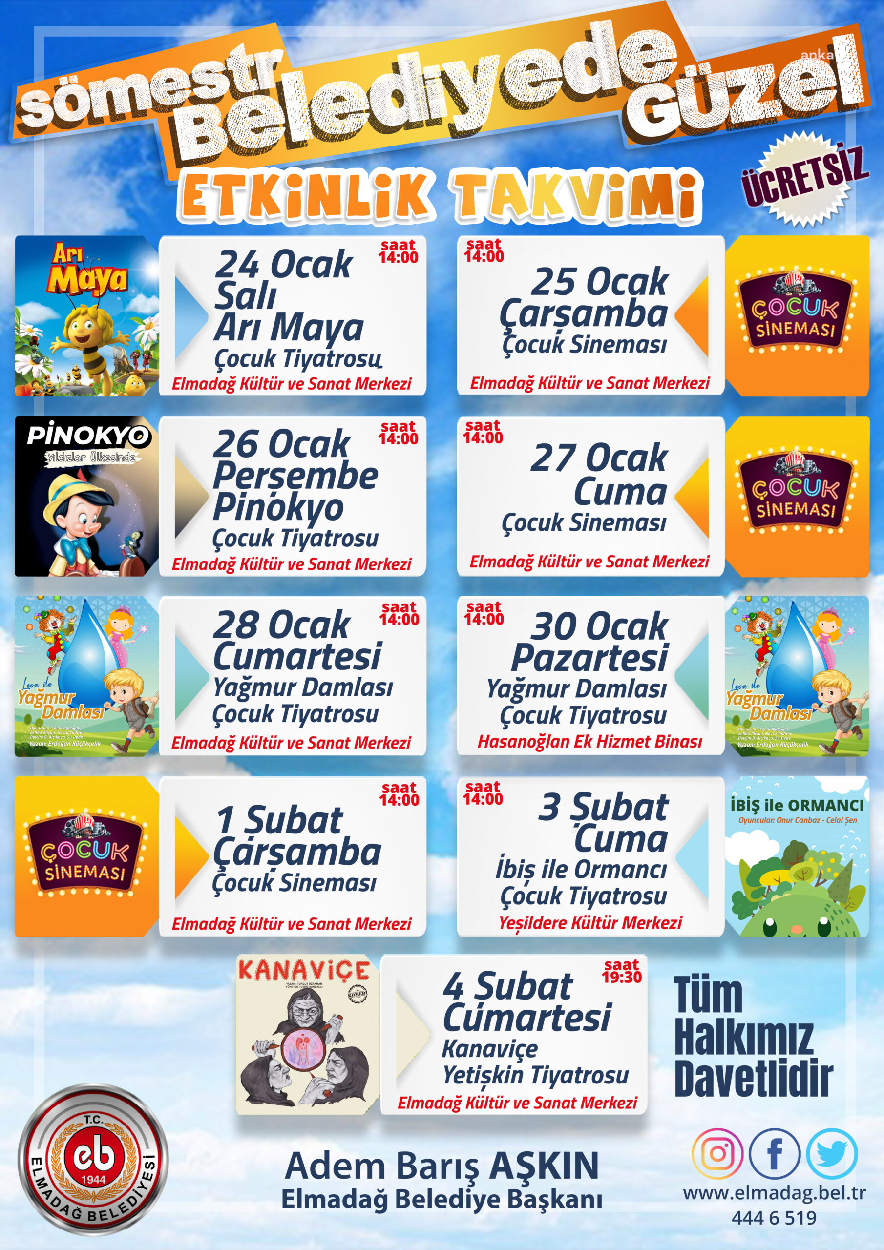 Elmadağ Belediyesi, 24 Ocak – 4 Şubat tarihleri arasında yarıyıl tatilinde çocukları ücretsiz gösterilerle buluşturacak.