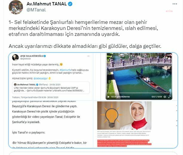 CHP İstanbul’daki genel başkan yardımcısı Mahmut Tanal, iki yıl önce Şanlıurfa merkezdeki Karakoyun Çayı’nın ıslahını sosyal medya hesabından paylaştığını ancak ardından AKP’lilerin bu uyarılara güldüğünü hatırlattı. Tanal, sosyal medya hesabından şu bilgileri paylaştı: