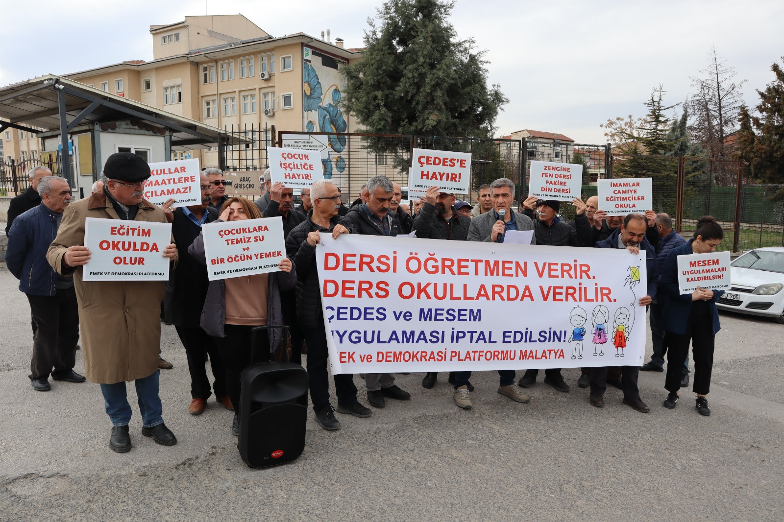 Malatya Milli Eğitim Müdürlüğü Binası önünde basın açıklaması yapan Emek ve Demokrasi Platformu, sesini MESEM ve ÇEDES’e karşı yükseltti. Platform adına basın metnini okuyan Eğitim-Sen Malatya Şubesi Nevzat Millioğulları, “Mesleki Eğitim Merkezleri (MESEM) ve eğitim sistemini büyük ölçüde dinselleştirmeyi hedefleyen ÇEDES projesinin sonuçları, öğrencilerimizin ve çocuklarımızın nasıl tehlikeli bir kuşatmayla karşı karşıya olduğunu göstermektedir.” dedi.