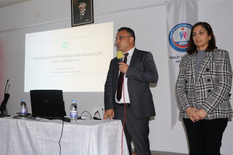 Toplantıda, alanı kapsayan kentsel dönüşüm bölgesinin mevcut durumunun analizi mahalle sakinlerine detaylı olarak anlatıldı.